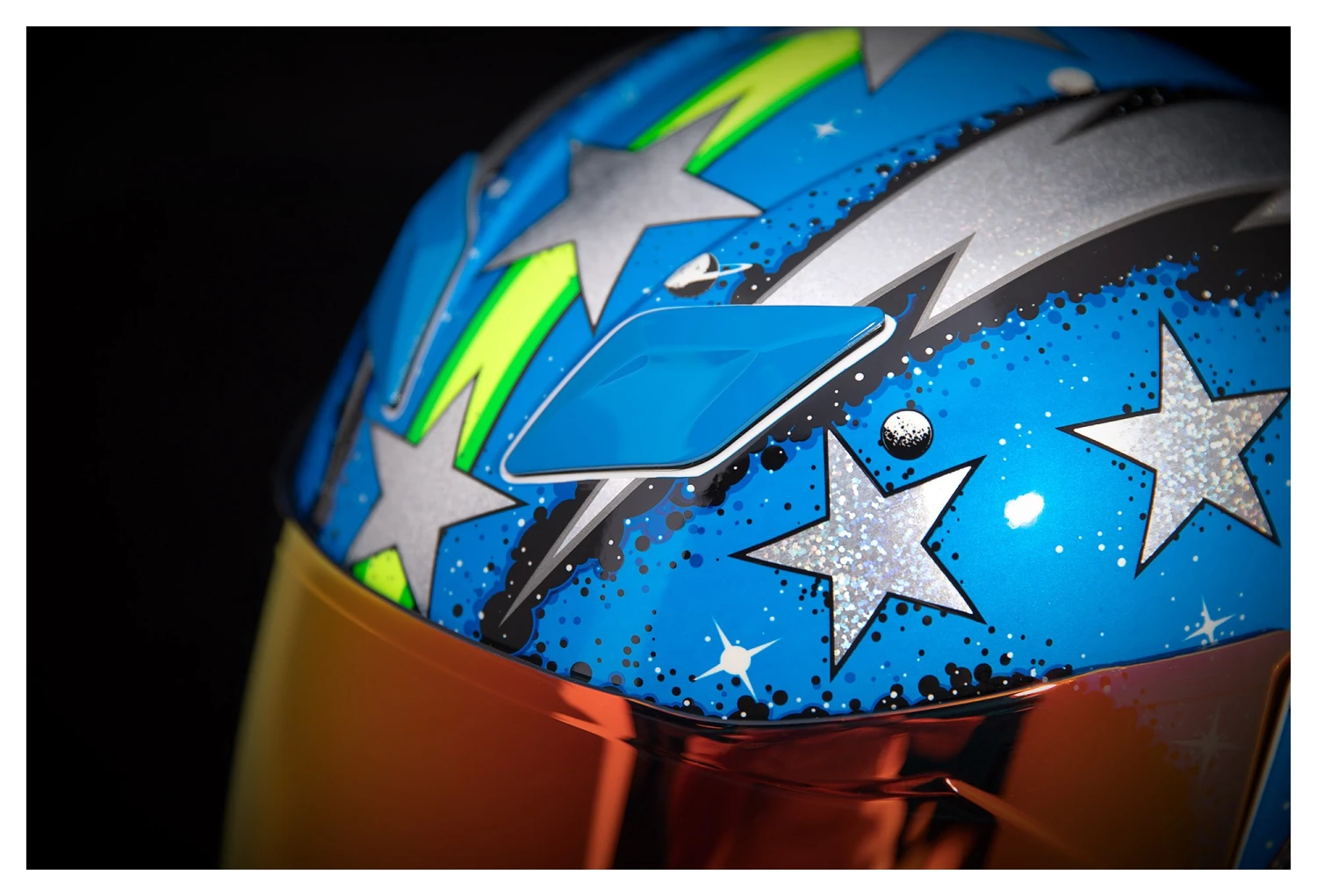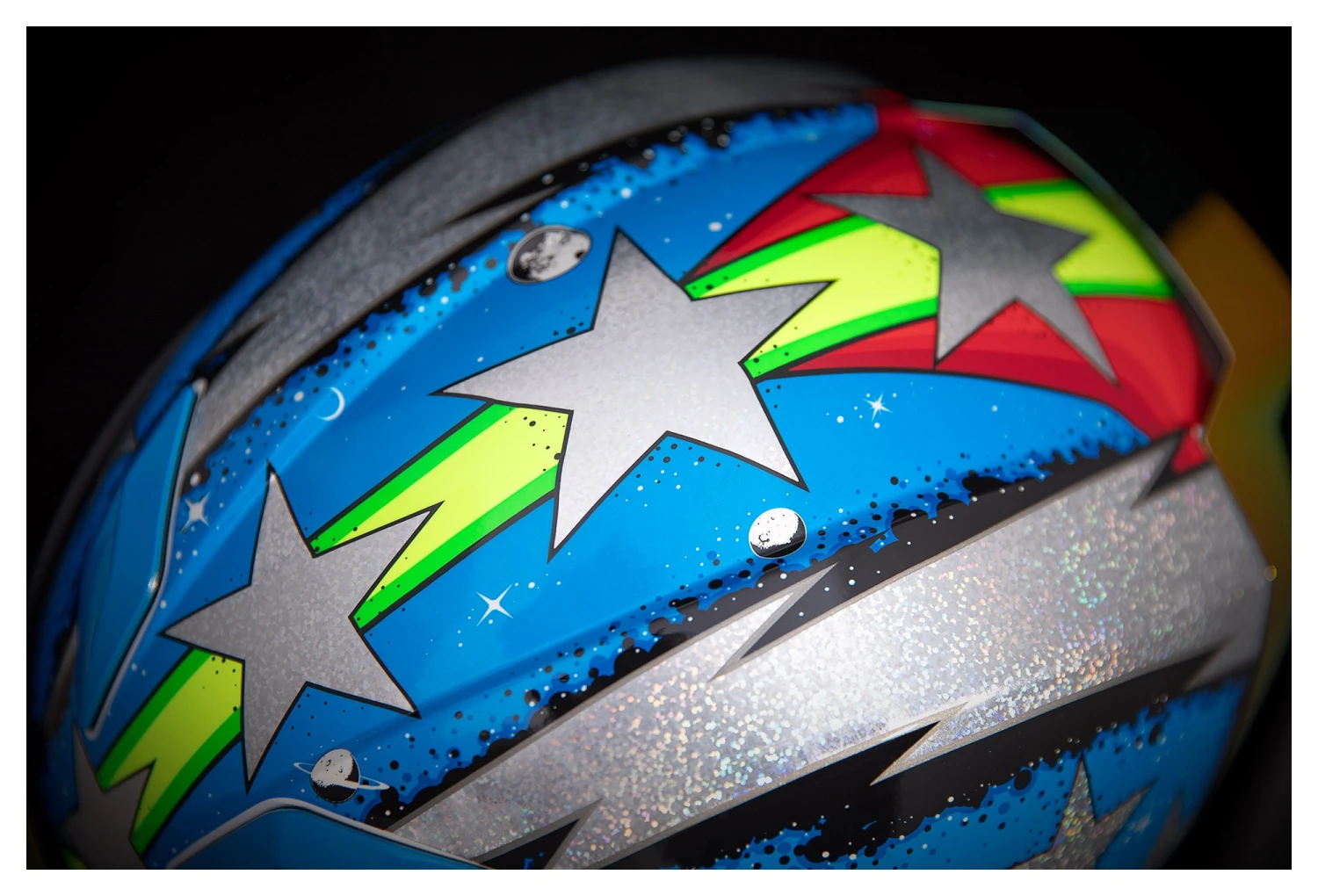 Silver flake and maximum planetary maps grace the exterior of the helmet while the new Forceshield stares firmly into the abyss. A drop down internal sun visor allows you to manage the sun or go to incognito mode at the flip of a switch. Removable Hydradry liner wicks moisture to keep your noggin dry and comfortable. The injection molded polycarbonate shell is strong to absorb energy and remain intact just in case you unintentionally headbutt cosmic debris.