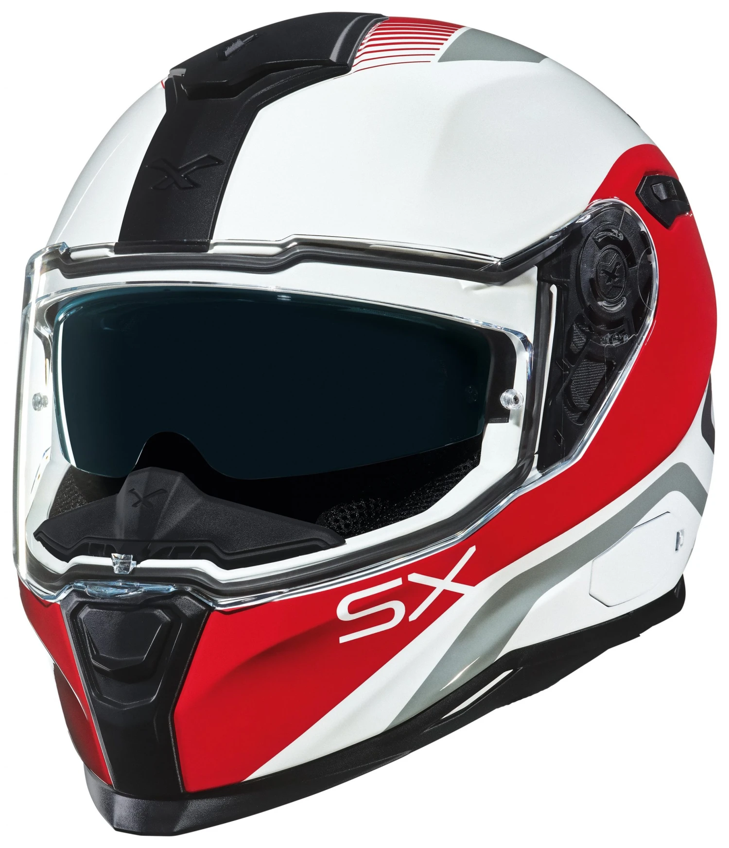 The SX100 is a solid sport and sport touring helmet with a plush interior, high quality shield seal and sizable drop down internal sunvisor. It’s the perfect helmet for the daily commuter or someone hitting the road for an extended trip. It has all of the necessary accoutrements that make up a quiet ride from its aggressively undercut neck roll to the perimeter seal around the view port; all of these components work in concert to occlude road noise. The drop down internal sun visor is easy to deploy, even with thick winter gloves, and saves you from carrying a spare shield to toggle between sunny morning versus evening commutes.Â
